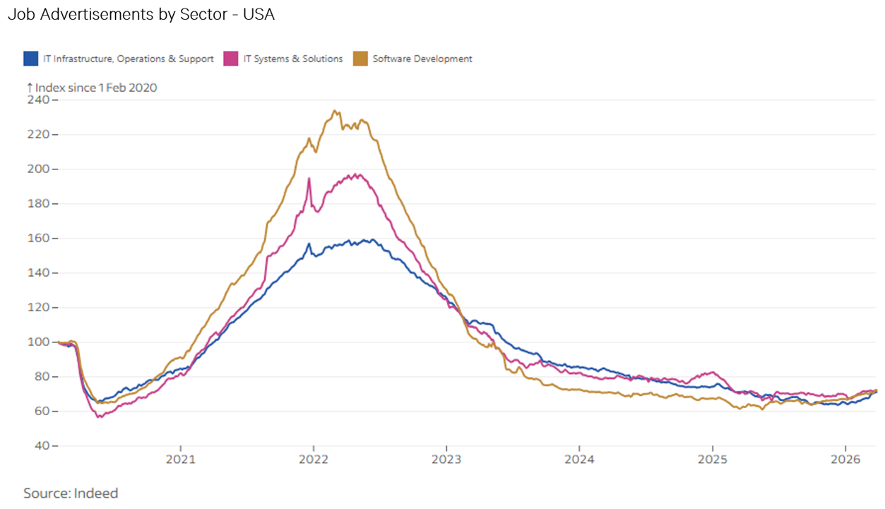 The one thing that is clear to us today is that frontier AI models in their current form are not even close to being a 1 for 1 replacement for a human. That may be a controversial statement given the rhetoric around AI, but we think today there are very few businesses in a position where they can remove an employee and switch on an AI subscription. The most obvious case in point is technology employment, particularly software. At the moment, the main thing AI is really good at is writing code. It follows that the first people to be replaced by AI would be software developers. The data, however, doesn’t back this up. Job ads for software developers in the US have actually risen slightly since the middle of last year.