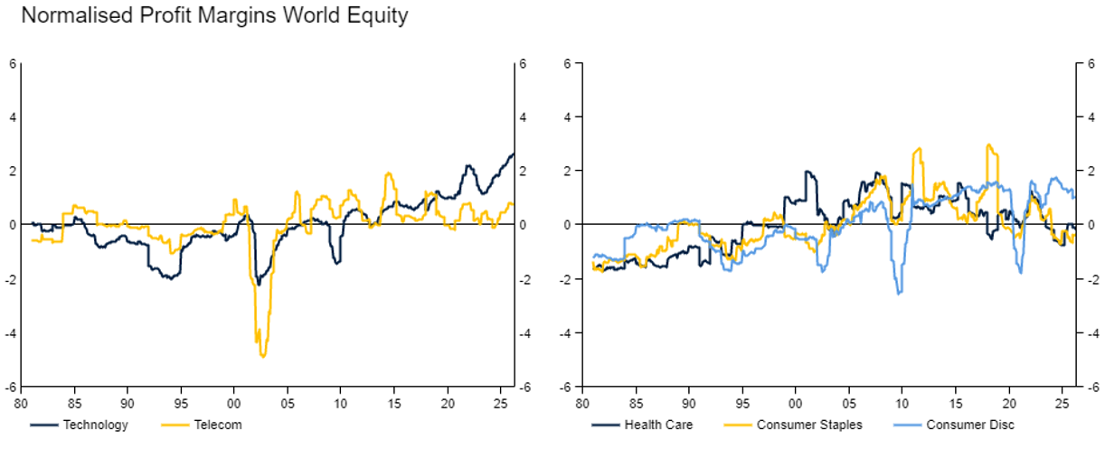 Below we can see some examples of this at the sector level. Profit margins across sectors generally sit around a long run average with variations above and below which are unwound. At the individual business level, it is likely the argument holds even more strongly.
